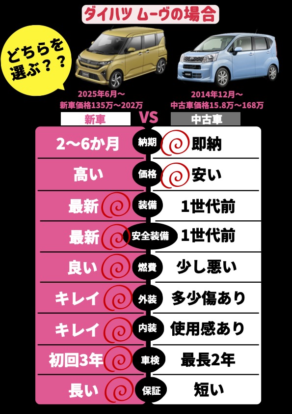 そこで今日は「新車にしようか、中古車にしようか…」と迷っている方に向けて、当店で作成した「新車VS中古車の比較表」をもとに、ムーヴを例にわかりやすく解説していきます。